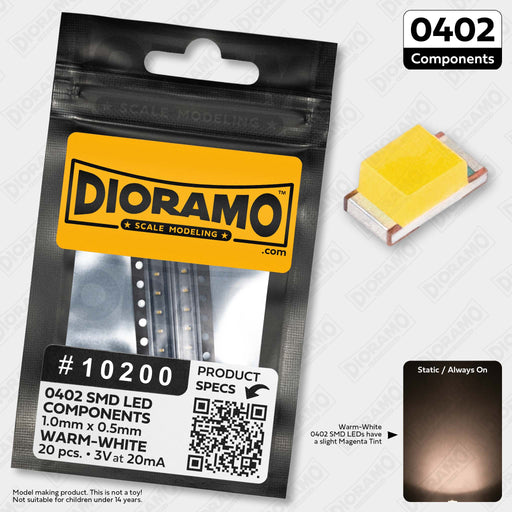 Dioramo #10200Dioramo Scale Modeling # 10200 20 Pieces of Warm White (2800-3200 K) 0402 SMD Mini LED Light Components, packaged in Cut Reel Tape. These 0402 SMD...