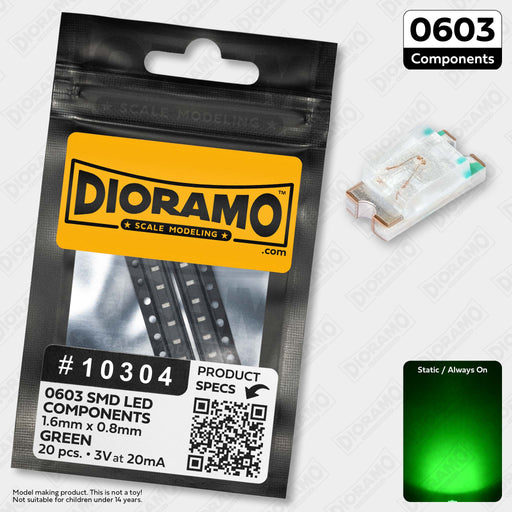 Dioramo #10304Dioramo Scale Modeling # 10304 20 Pieces of Green 0603 SMD Mini LED Light Components, packaged in Cut Reel Tape. These 0603 SMD LED Components are...